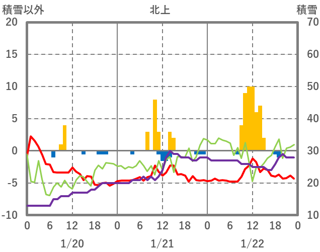 | 日 | 時 | 気温 | 降水 | 風向/風速 | 日照 | 積雪 | 降雪 |