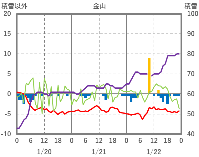 | 日 | 時 | 気温 | 降水 | 風向/風速 | 日照 | 積雪 | 降雪 |