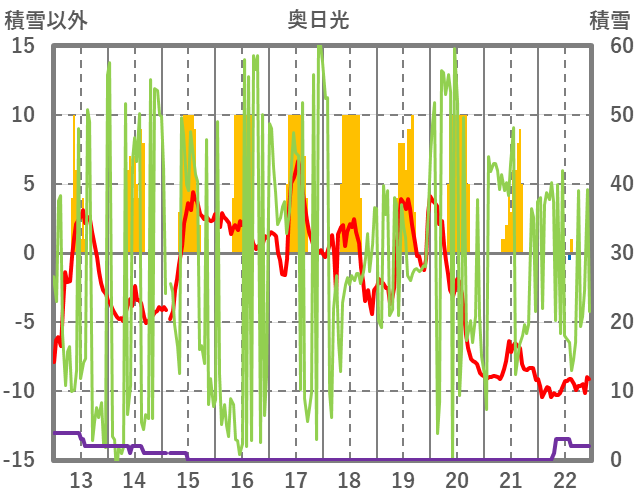 | 日 | 時 | 気温 | 降水 | 風向/風速 | 日照 | 積雪 | 降雪 |