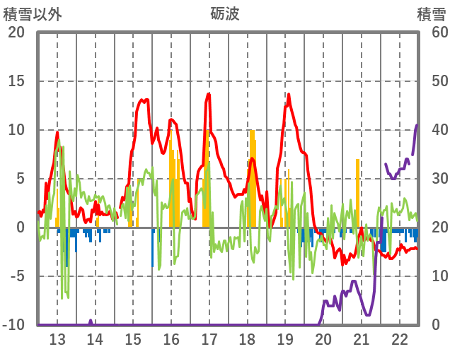| 日 | 時 | 気温 | 降水 | 風向/風速 | 日照 | 積雪 | 降雪 |