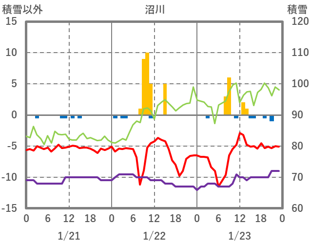 | 日 | 時 | 気温 | 降水 | 風向/風速 | 日照 | 積雪 | 降雪 |