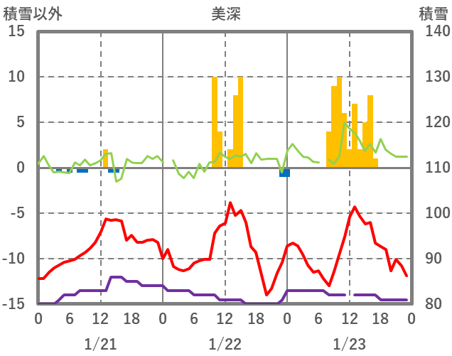 | 日 | 時 | 気温 | 降水 | 風向/風速 | 日照 | 積雪 | 降雪 |