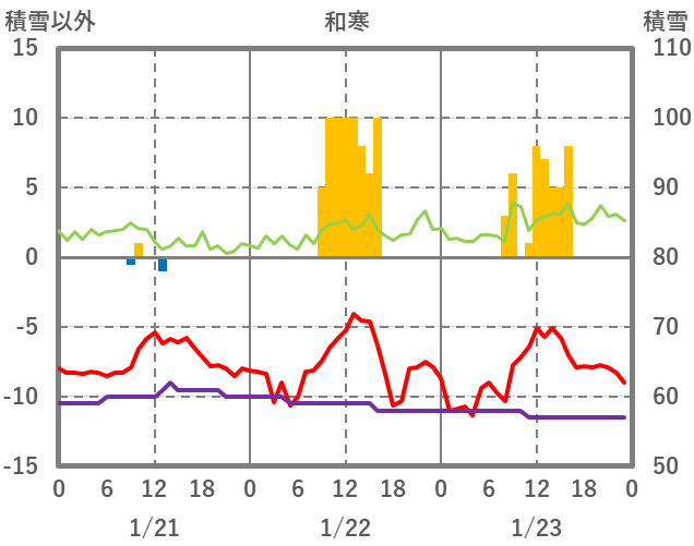 | 日 | 時 | 気温 | 降水 | 風向/風速 | 日照 | 積雪 | 降雪 |