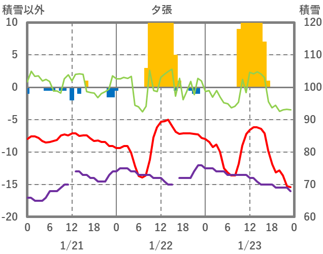 | 日 | 時 | 気温 | 降水 | 風向/風速 | 日照 | 積雪 | 降雪 |