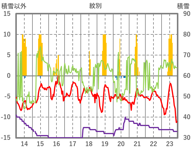 | 日 | 時 | 気温 | 降水 | 風向/風速 | 日照 | 積雪 | 降雪 |