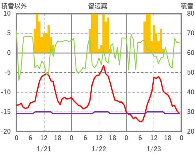 | 日 | 時 | 気温 | 降水 | 風向/風速 | 日照 | 積雪 | 降雪 |