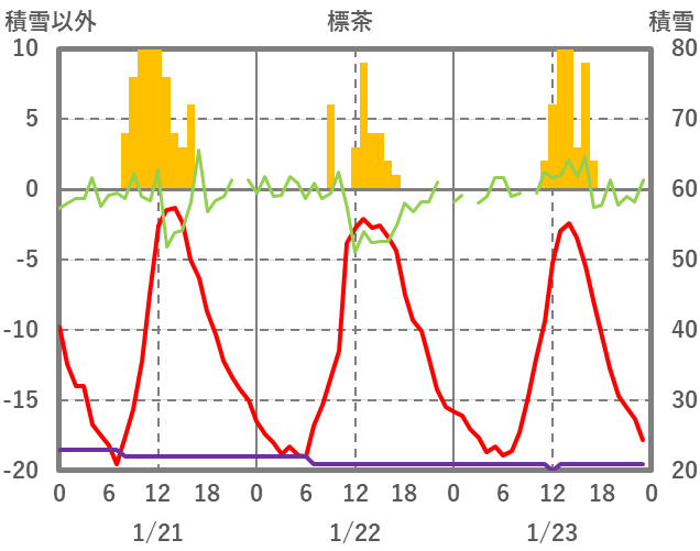 | 日 | 時 | 気温 | 降水 | 風向/風速 | 日照 | 積雪 | 降雪 |