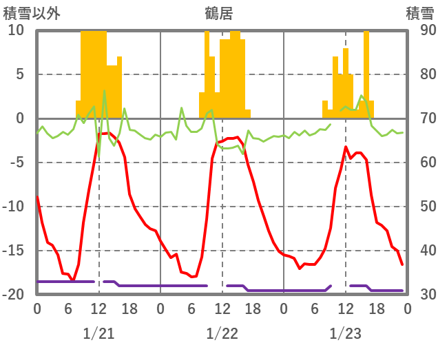 | 日 | 時 | 気温 | 降水 | 風向/風速 | 日照 | 積雪 | 降雪 |