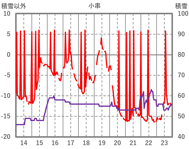| 日 | 時 | 気温 | 降水 | 風向/風速 | 日照 | 積雪 | 降雪 |