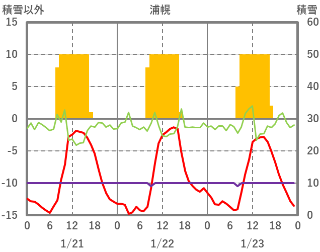 | 日 | 時 | 気温 | 降水 | 風向/風速 | 日照 | 積雪 | 降雪 |