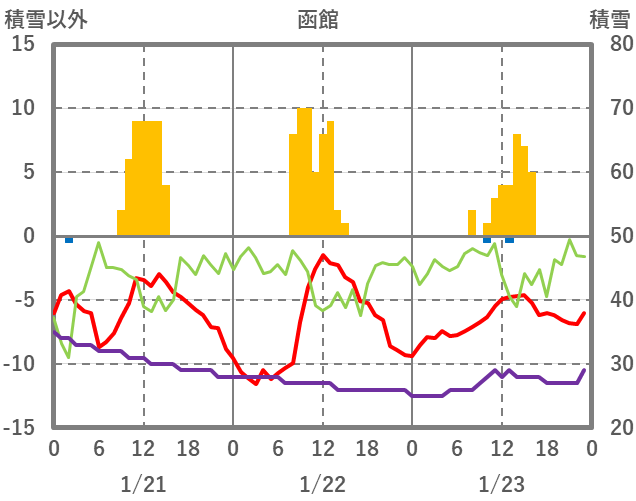 | 日 | 時 | 気温 | 降水 | 風向/風速 | 日照 | 積雪 | 降雪 |