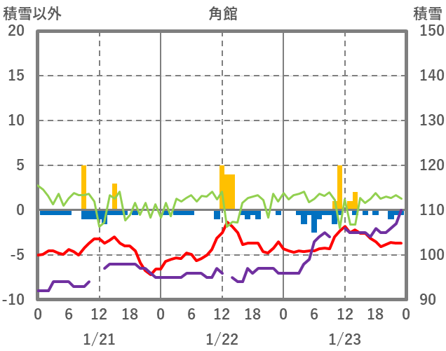 | 日 | 時 | 気温 | 降水 | 風向/風速 | 日照 | 積雪 | 降雪 |