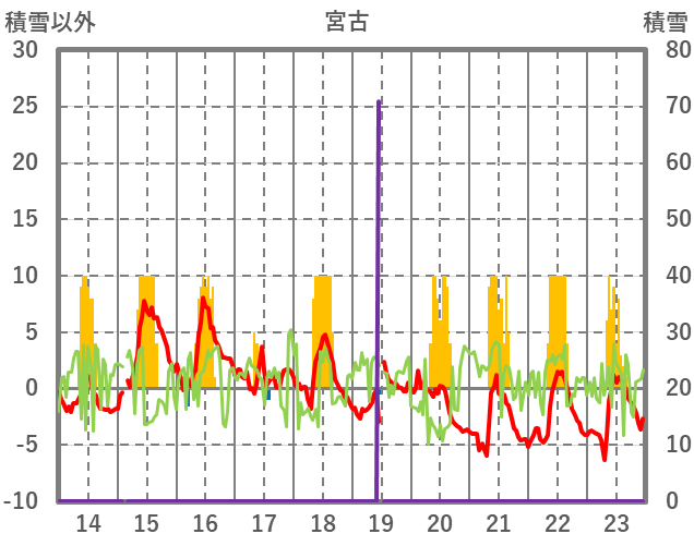 | 日 | 時 | 気温 | 降水 | 風向/風速 | 日照 | 積雪 | 降雪 |