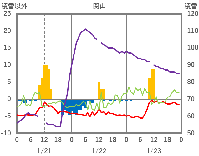 | 日 | 時 | 気温 | 降水 | 風向/風速 | 日照 | 積雪 | 降雪 |