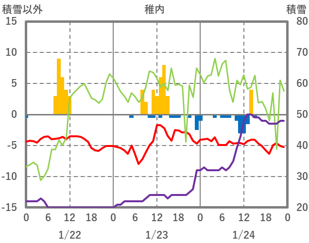 | 日 | 時 | 気温 | 降水 | 風向/風速 | 日照 | 積雪 | 降雪 |