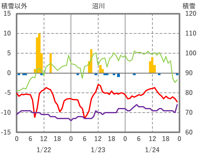 | 日 | 時 | 気温 | 降水 | 風向/風速 | 日照 | 積雪 | 降雪 |