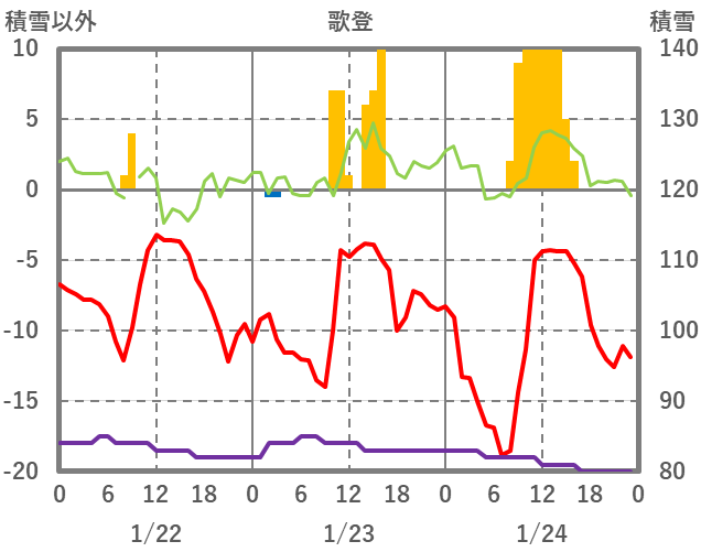 | 日 | 時 | 気温 | 降水 | 風向/風速 | 日照 | 積雪 | 降雪 |