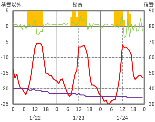 | 日 | 時 | 気温 | 降水 | 風向/風速 | 日照 | 積雪 | 降雪 |