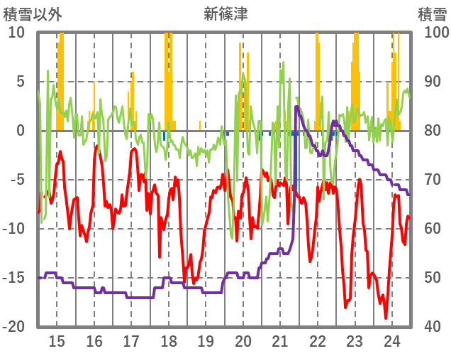 | 日 | 時 | 気温 | 降水 | 風向/風速 | 日照 | 積雪 | 降雪 |