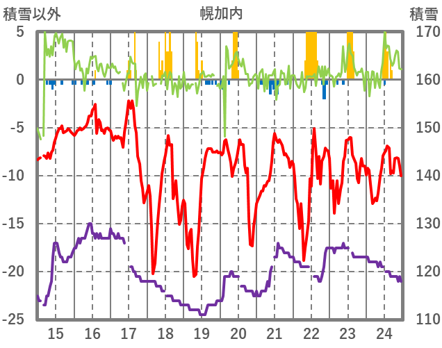 | 日 | 時 | 気温 | 降水 | 風向/風速 | 日照 | 積雪 | 降雪 |