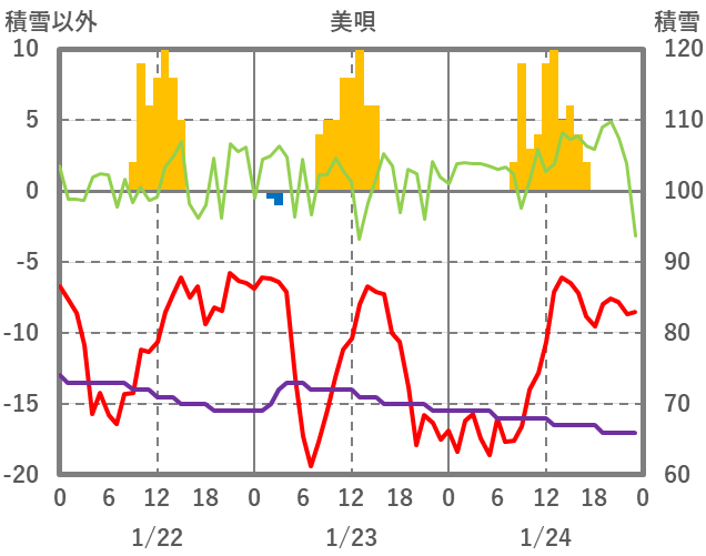 | 日 | 時 | 気温 | 降水 | 風向/風速 | 日照 | 積雪 | 降雪 |