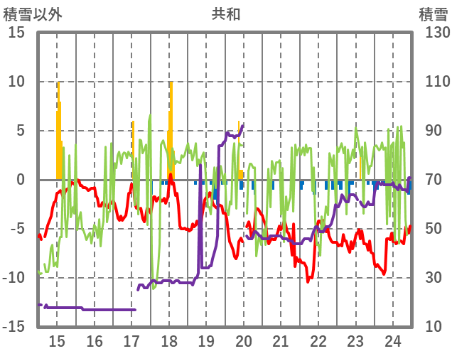 | 日 | 時 | 気温 | 降水 | 風向/風速 | 日照 | 積雪 | 降雪 |