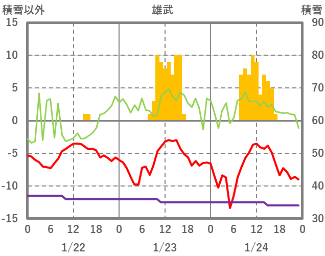 | 日 | 時 | 気温 | 降水 | 風向/風速 | 日照 | 積雪 | 降雪 |