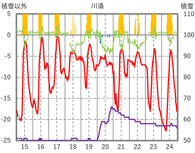 | 日 | 時 | 気温 | 降水 | 風向/風速 | 日照 | 積雪 | 降雪 |