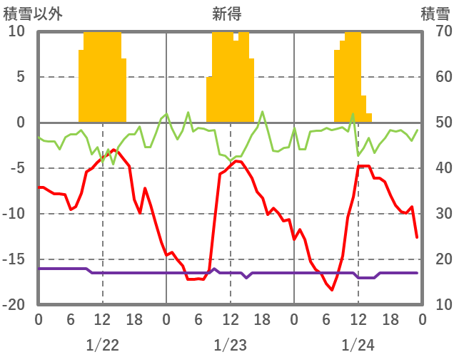 | 日 | 時 | 気温 | 降水 | 風向/風速 | 日照 | 積雪 | 降雪 |