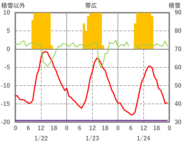 | 日 | 時 | 気温 | 降水 | 風向/風速 | 日照 | 積雪 | 降雪 |