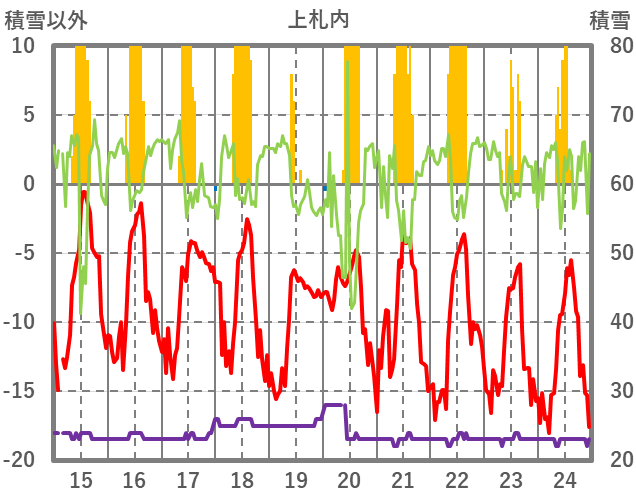 | 日 | 時 | 気温 | 降水 | 風向/風速 | 日照 | 積雪 | 降雪 |
