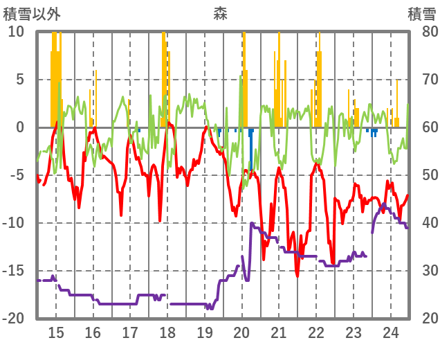| 日 | 時 | 気温 | 降水 | 風向/風速 | 日照 | 積雪 | 降雪 |