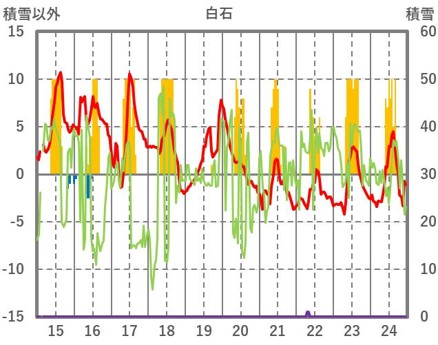 | 日 | 時 | 気温 | 降水 | 風向/風速 | 日照 | 積雪 | 降雪 |