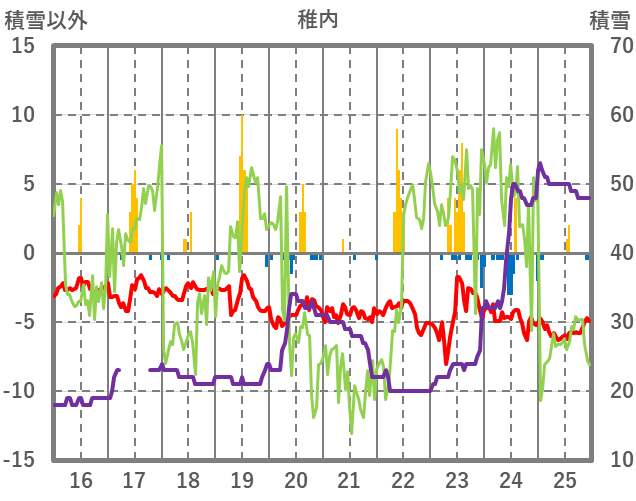 | 日 | 時 | 気温 | 降水 | 風向/風速 | 日照 | 積雪 | 降雪 |