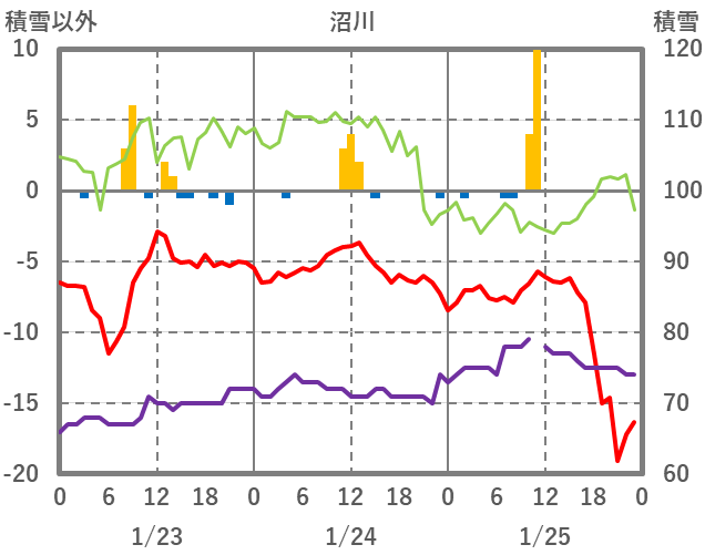 | 日 | 時 | 気温 | 降水 | 風向/風速 | 日照 | 積雪 | 降雪 |