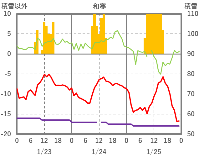 | 日 | 時 | 気温 | 降水 | 風向/風速 | 日照 | 積雪 | 降雪 |