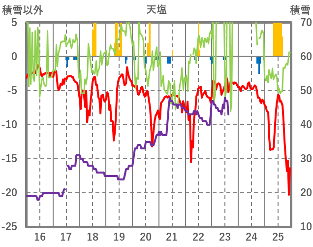 | 日 | 時 | 気温 | 降水 | 風向/風速 | 日照 | 積雪 | 降雪 |