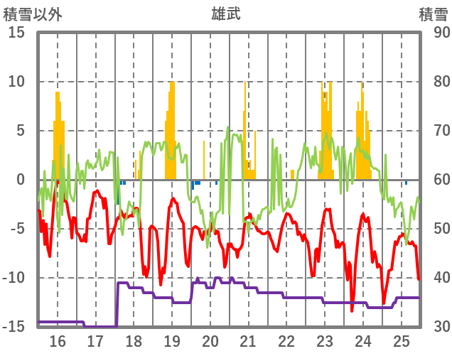 | 日 | 時 | 気温 | 降水 | 風向/風速 | 日照 | 積雪 | 降雪 |