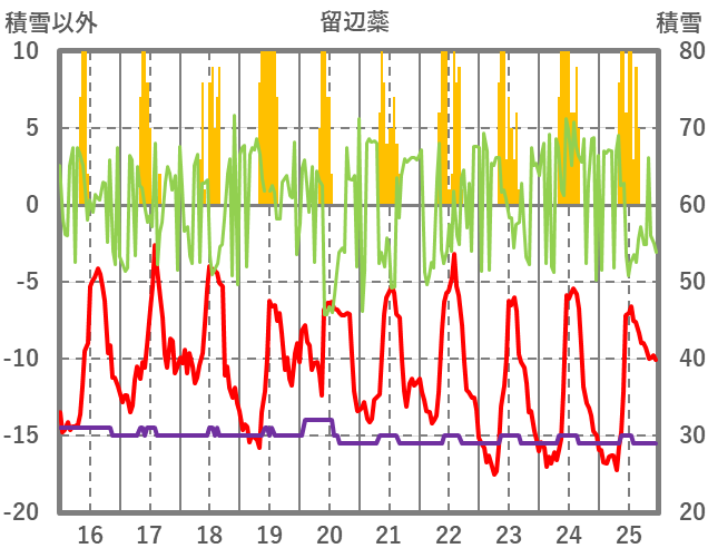 | 日 | 時 | 気温 | 降水 | 風向/風速 | 日照 | 積雪 | 降雪 |