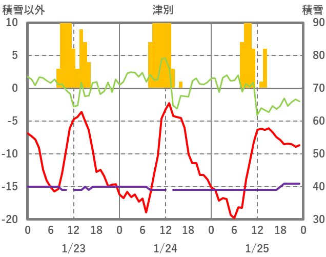 | 日 | 時 | 気温 | 降水 | 風向/風速 | 日照 | 積雪 | 降雪 |