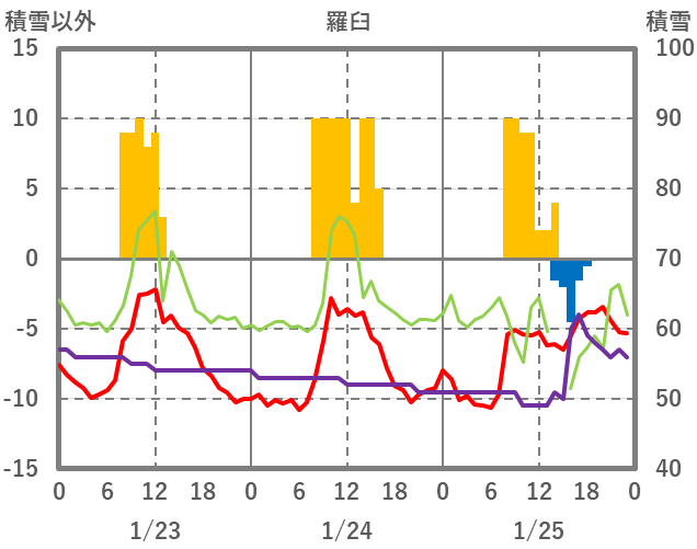 | 日 | 時 | 気温 | 降水 | 風向/風速 | 日照 | 積雪 | 降雪 |