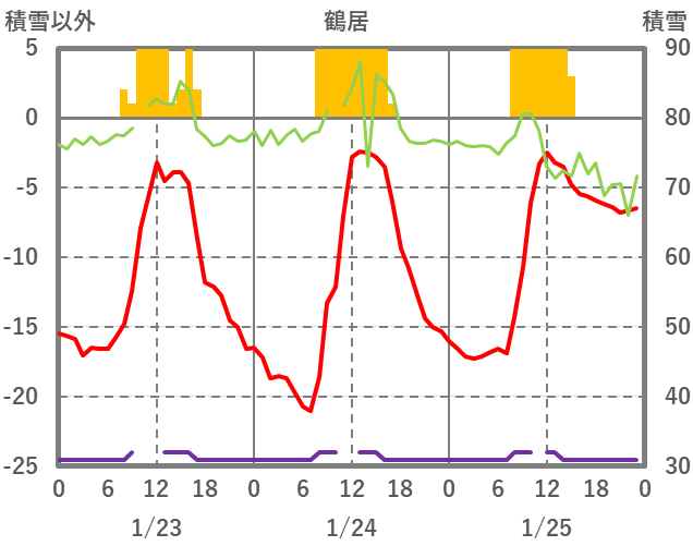 | 日 | 時 | 気温 | 降水 | 風向/風速 | 日照 | 積雪 | 降雪 |