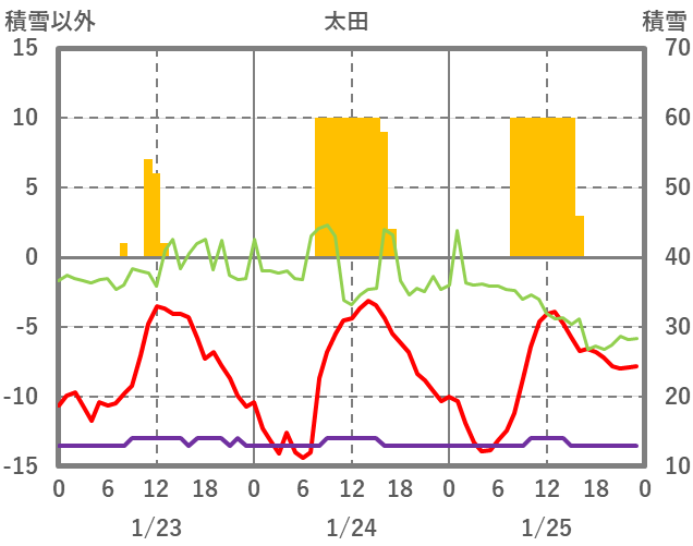 | 日 | 時 | 気温 | 降水 | 風向/風速 | 日照 | 積雪 | 降雪 |