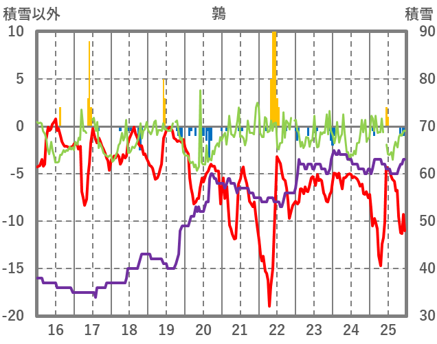 | 日 | 時 | 気温 | 降水 | 風向/風速 | 日照 | 積雪 | 降雪 |