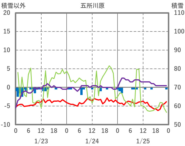 | 日 | 時 | 気温 | 降水 | 風向/風速 | 日照 | 積雪 | 降雪 |