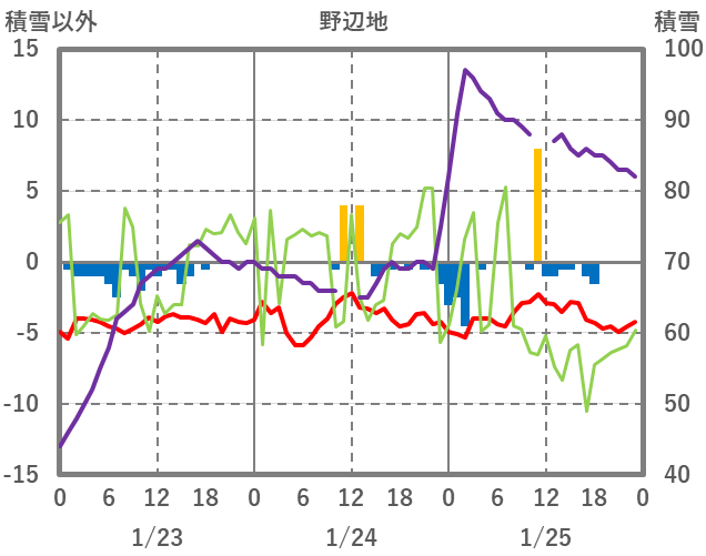 | 日 | 時 | 気温 | 降水 | 風向/風速 | 日照 | 積雪 | 降雪 |