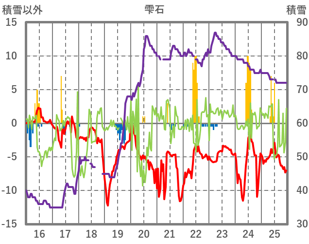 | 日 | 時 | 気温 | 降水 | 風向/風速 | 日照 | 積雪 | 降雪 |