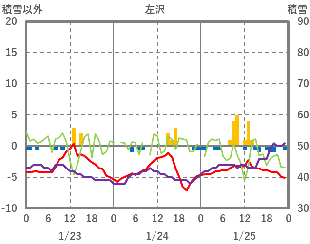 | 日 | 時 | 気温 | 降水 | 風向/風速 | 日照 | 積雪 | 降雪 |