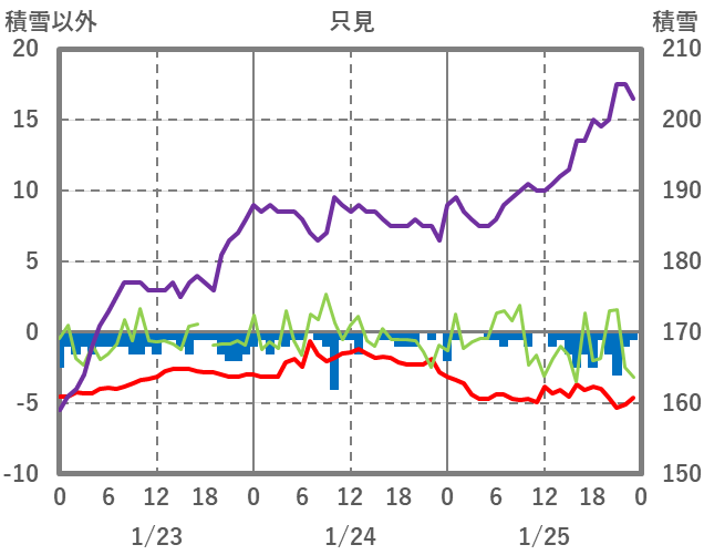 | 日 | 時 | 気温 | 降水 | 風向/風速 | 日照 | 積雪 | 降雪 |