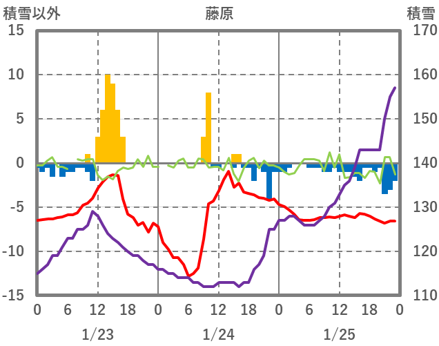 | 日 | 時 | 気温 | 降水 | 風向/風速 | 日照 | 積雪 | 降雪 |